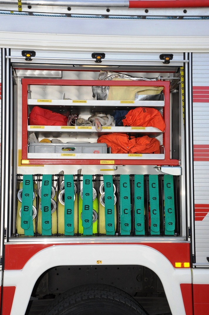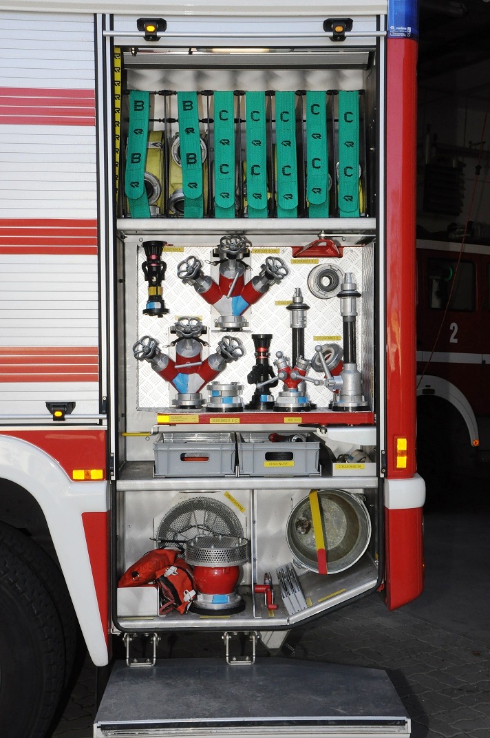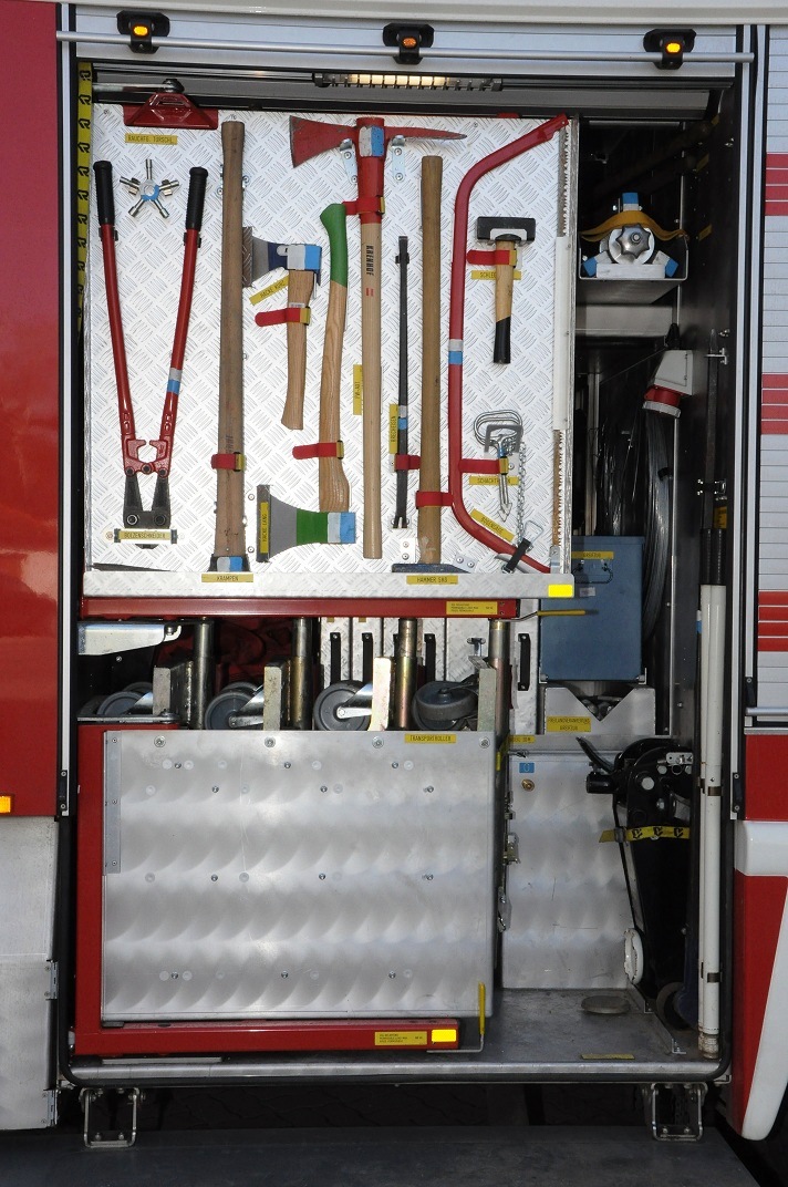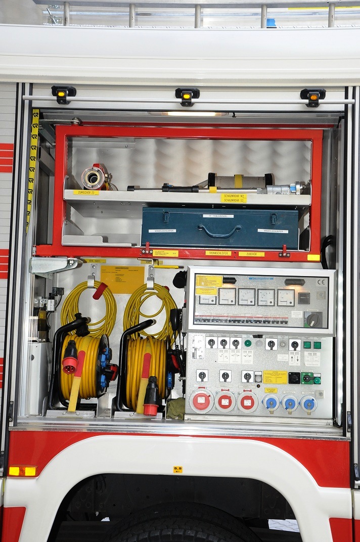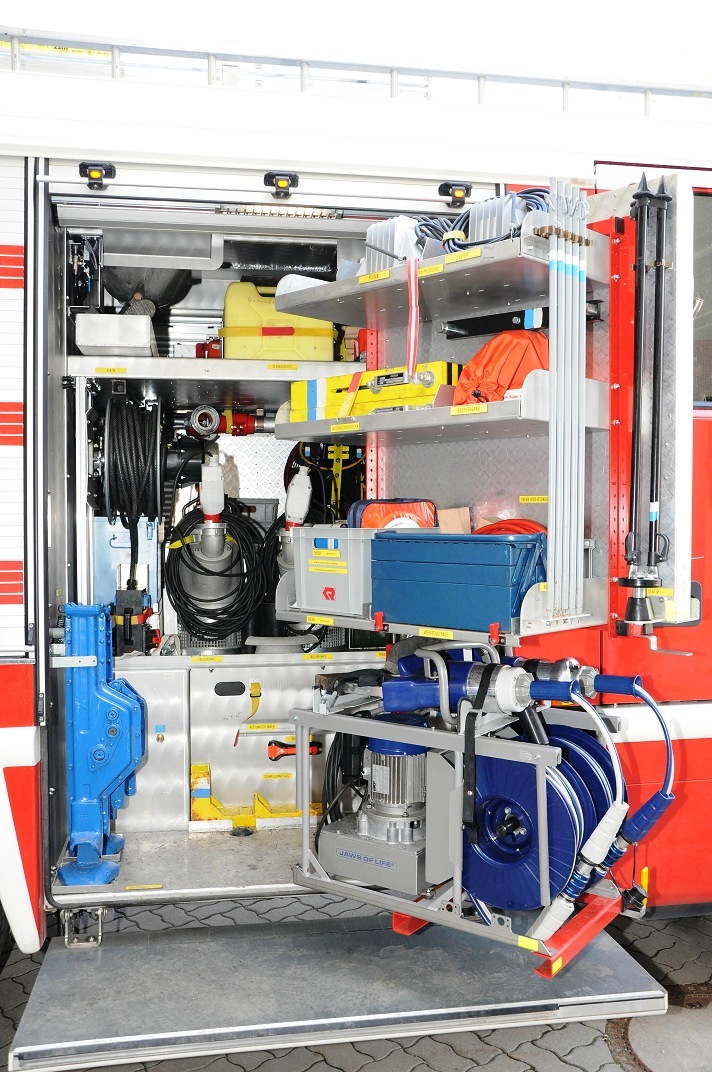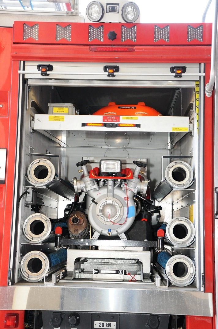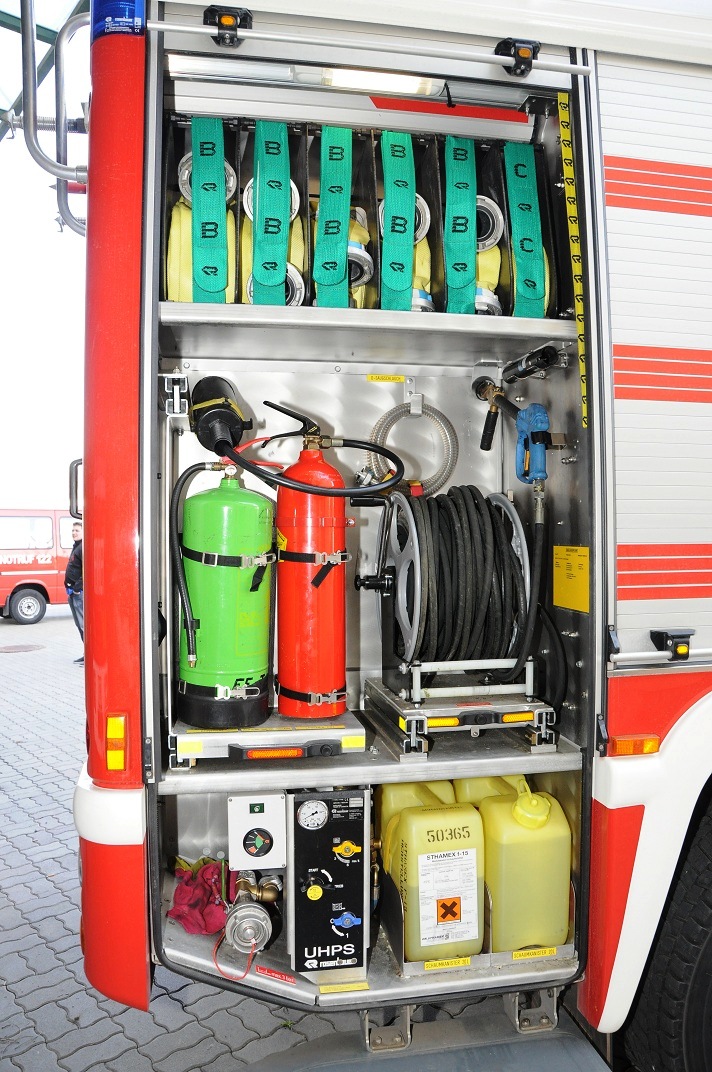 Tragkraftspritze Fox III, UHPS (Ultra High Pressure System/Hochdruck-Schnellangriffseinrichtung) mit 800 l Wassertank, Atemschutz, Unterwasserpumpen, Einbaugenerator 30 kVA, hydraulischer Rettungssatz, Hebekissen, Rangierroller, 3-teilige Schiebeleiter, Überdruckbelüfter, Seilwinde