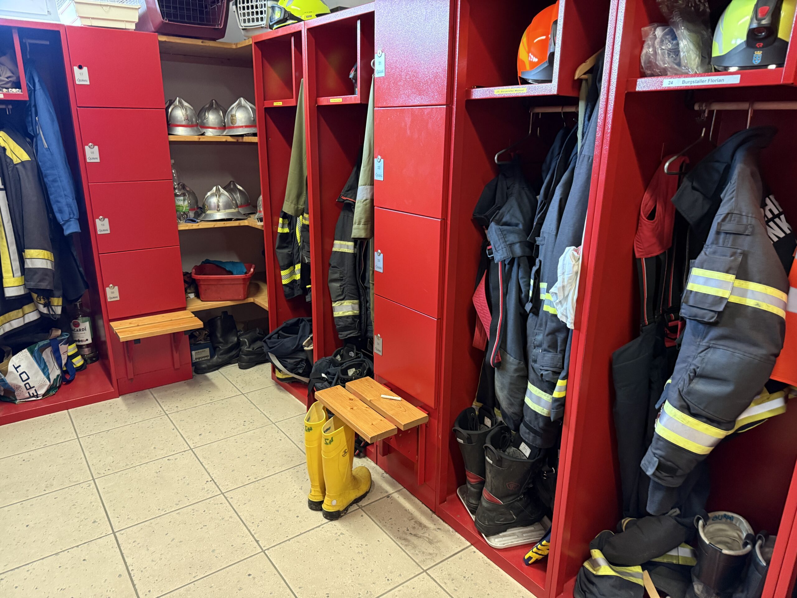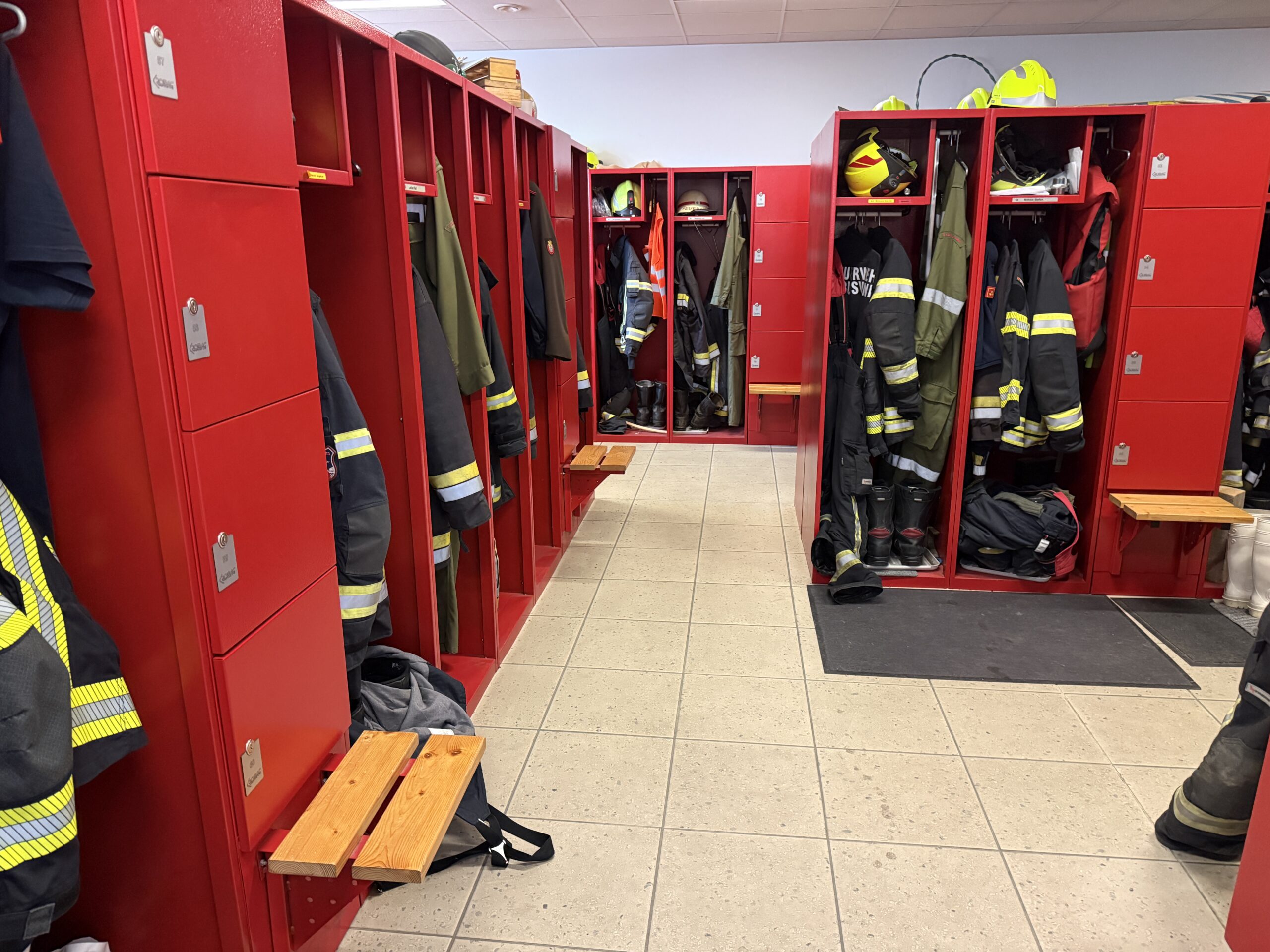 Ebenfalls im Erdgeschoß befinden sich die Garderoben. Sie bieten allen Mitgliedern ausreichend Platz für Ihre persönliche Ausrüstung. Zusätzlich verfügt jeder über ein Schließfach, in dem während eines Einsatzes, aber auch bei Veranstaltungen und sonstigen Aktivitäten Wertsachen wie Brieftaschen, Handys etc. verwahrt werden können. Beide Garderoben sind mit Waschräumen und Duschen ausgestatten, die nach einem Einsatz benützt werden können.