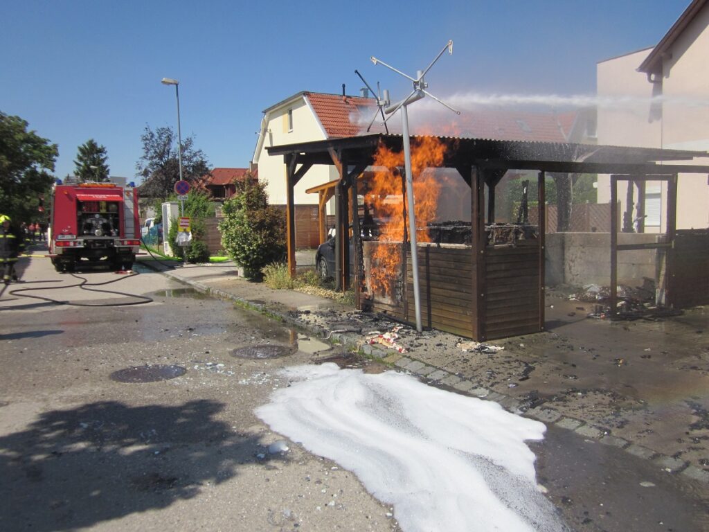 heiße Asche geriet ein Müllbehälter in Brand und entzündete eine Gasleitung. Da der Gasschrank unter einem Carport stand, brannte dieses lichterloh. Bis zum